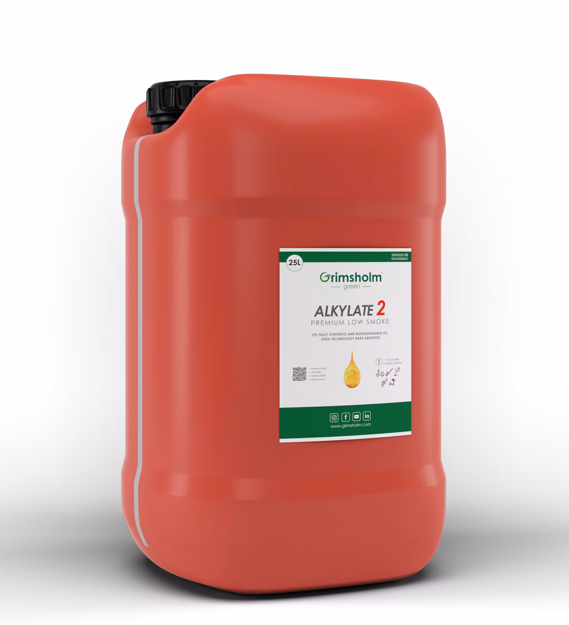 2-taktsversionen av Grimsholm Alkylate är förblandad med 2% helt syntetisk olja och tillsatser som ger en idealisk balans mellan kraft och minimala rökutsläpp. Den är kompatibel med alla 2-takts bensinmotorer och är därför ett mångsidigt och pålitligt alternativ.