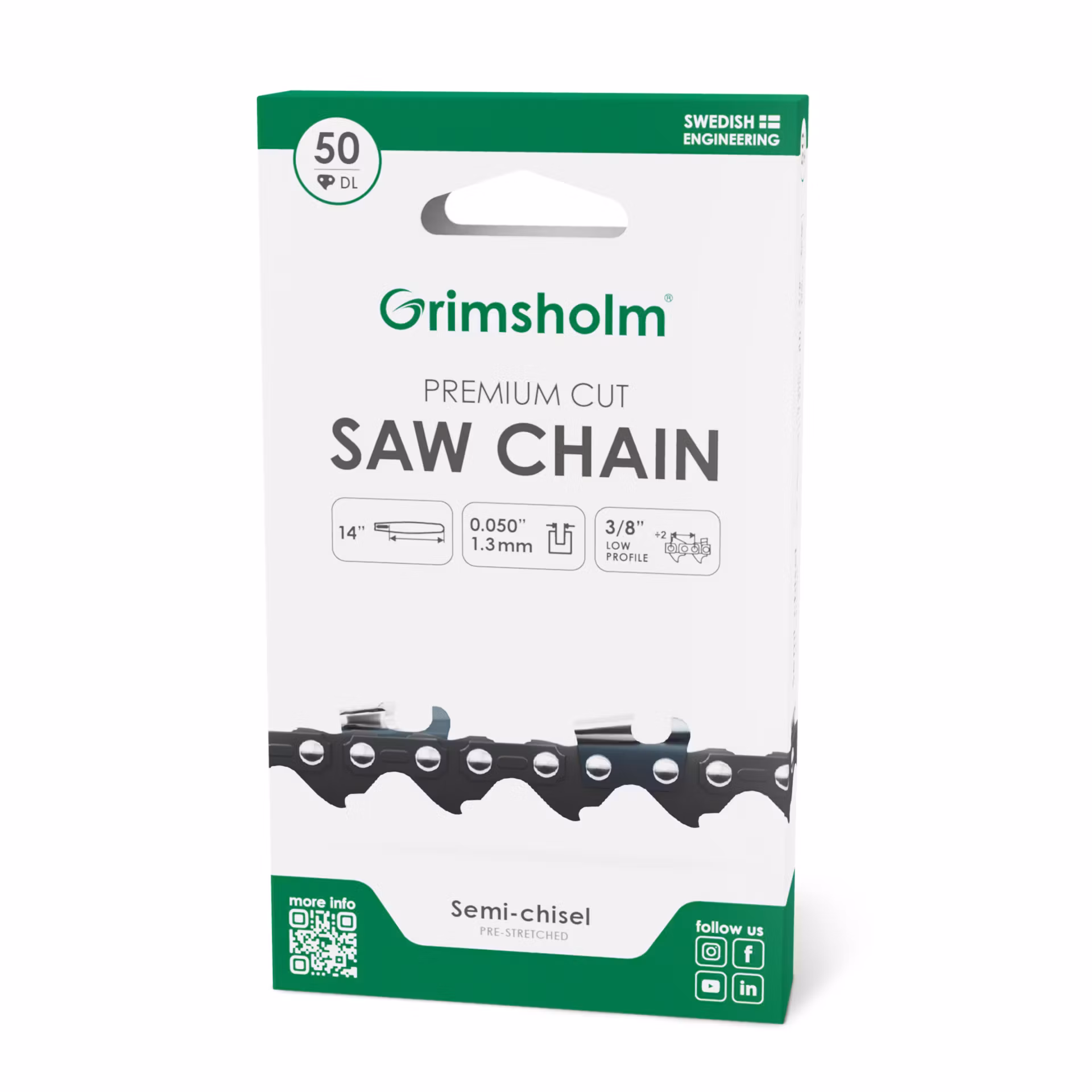 Grimsholm motorsågskedjor finns i många specifikationer. Välj bara rätt kedja för din motorsåg från det breda utbudet och njut av den problemfria Grimsholm-upplevelsen i sågningen.